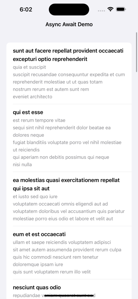 When you run this example, the app will fetch a list of posts from the mock API (https://jsonplaceholder.typicode.com/posts) and display them in a list view. The task modifier ensures that the fetchPosts function is called when the view appears, and the posts are displayed once they are fetched.