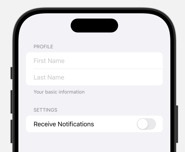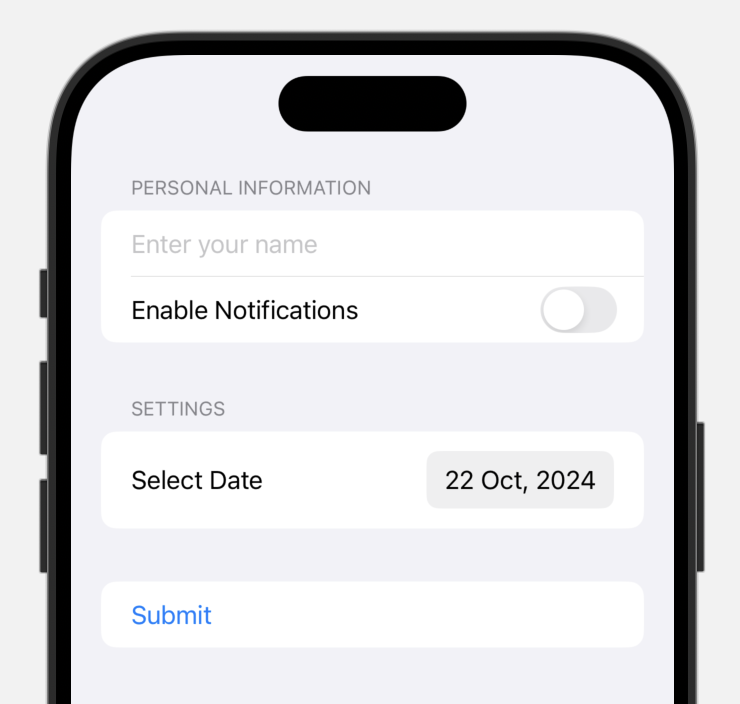 Form is a container that groups input elements like text fields, buttons, toggles, and pickers in a structured layout commonly used for data entry. It’s often used for settings pages, registration forms, or any situation where user input is required. Form automatically arranges and spaces out its child views, making it an ideal choice for creating structured user interfaces.
